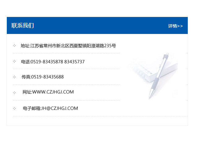 地址:常州市新北區友邦商務大廈1幢16、17層  電話:0519-85101652  傳真:0519-85112595  郵編:213022  網址:www_cz-jiayue_cn.tczlwx.com  郵箱:xiajifengaa@163.com